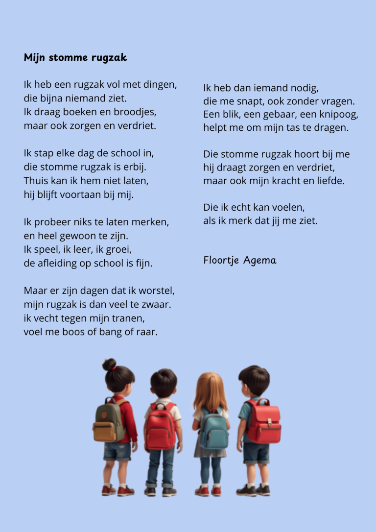Het gedicht ‘Mijn stomme rugzak’ van Floortje Agema is voor ons de reden waarom wij denken dat traumasensitief onderwijs noodzakelijk is voor alle kinderen en jongeren. Leerkrachten kunnen ècht het verschil maken.